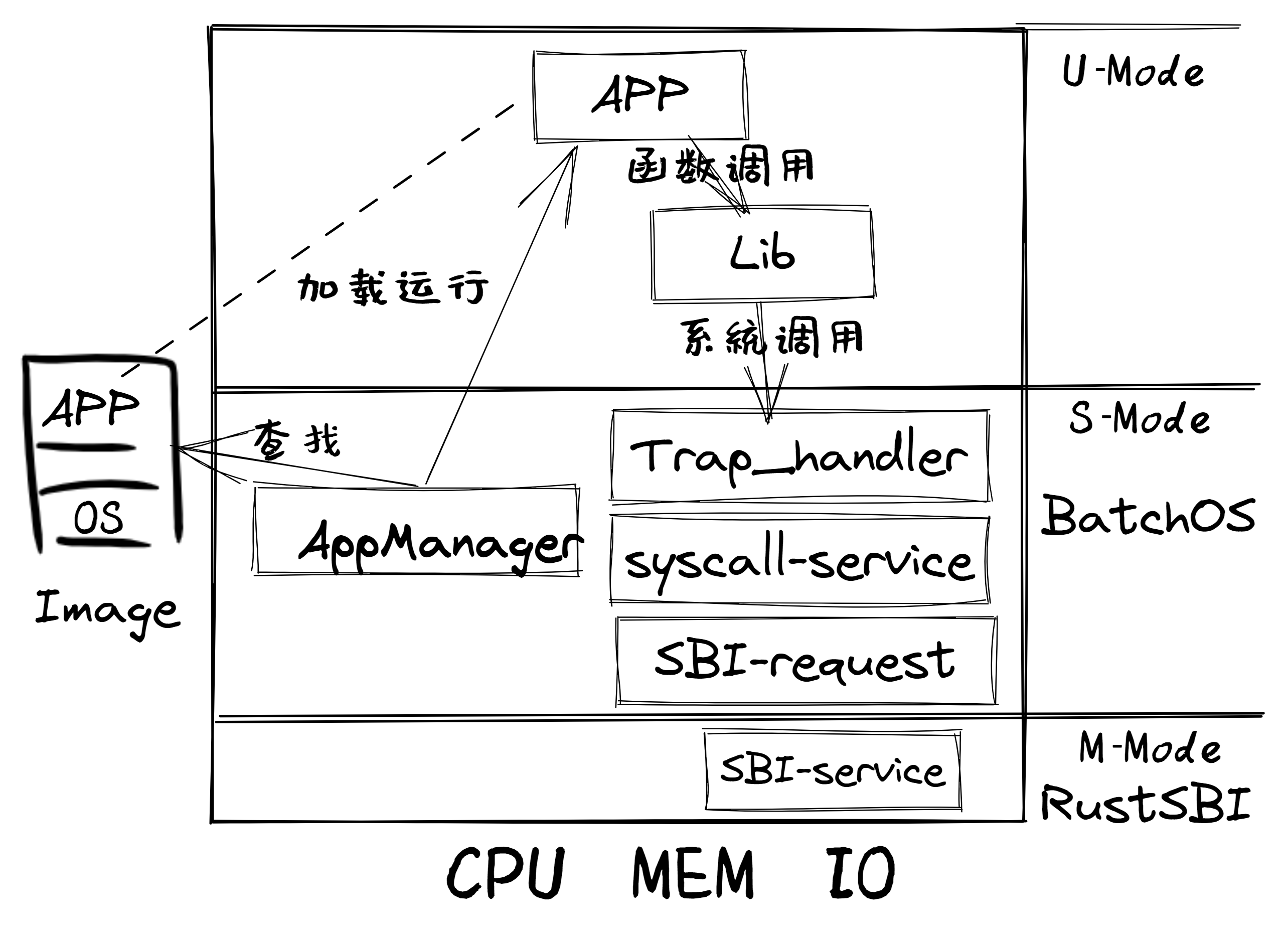 通过上图,大致可以看出Qemu把包含多个app的列表和BatchOS的image镜像加载到内存中,RustSBI(bootloader)完成基本的硬件初始化后,跳转到邓式鱼BatchOS起始位置,邓式鱼BatchOS首先进行正常运行前的初始化工作,即建立栈空间和清零bss段,然后通过 AppManager 内核模块从app列表中依次加载各个app到指定的内存中在用户态执行。app在执行过程中,会通过系统调用的方式得到邓式鱼BatchOS提供的OS服务,如输出字符串等。