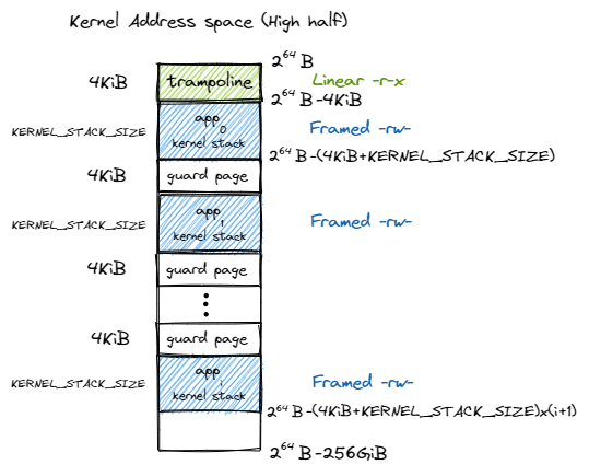 左侧给出了应用地址空间最低 \(256\text{GiB}\) 的布局:从 \(\text{0x10000}\) 开始向高地址放置应用内存布局中的各个逻辑段,最后放置带有一个保护页面的用户栈。这些逻辑段都是以 Framed 方式映射到物理内存的,从访问方式上来说都加上了 U 标志位代表 CPU 可以在 U 特权级也就是执行应用代码的时候访问它们。右侧则给出了最高的 \(256\text{GiB}\) ,可以看出它只是和内核地址空间一样将跳板放置在最高页,还将 Trap 上下文放置在次高页中。这两个虚拟页面虽然位于应用地址空间,但是它们并不包含 U 标志位,事实上它们在地址空间切换的时候才会发挥作用,请同样参考本章的最后一节。