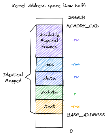 其中 Identical 表示上一节提到的恒等映射方式;而 Framed 则表示对于每个虚拟页面都有一个新分配的物理页帧与之对应,虚地址与物理地址的映射关系是相对随机的。恒等映射方式主要是用在启用多级页表之后,内核仍能够在虚存地址空间中访问一个特定的物理地址指向的物理内存。