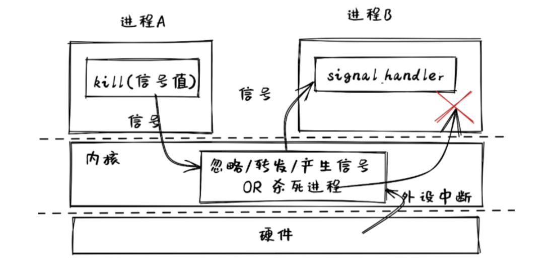 如果将信号与硬件中断进行比较,我们可以把信号描述为软件中断。当硬件发出中断后,中断响应的对象是操作系统,并由操作系统预设的中断处理例程来具体地进行中断的响应和处理;对于信号来说,当某进程或操作系统发出信号时,会指定信号响应的对象,即某个进程的 pid ,并由该进程预设的信号处理例程来进行具体的信号响应。