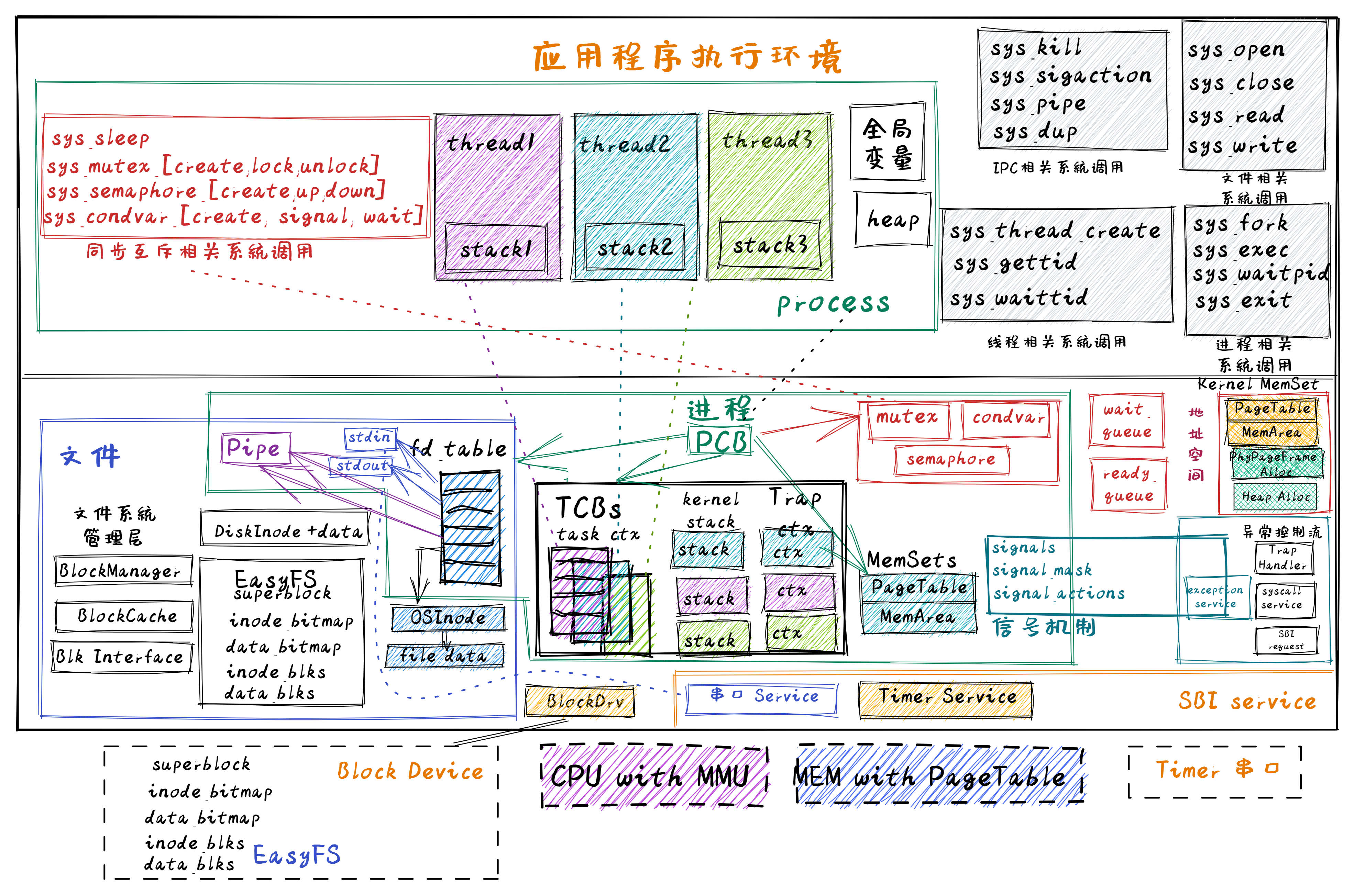 而关于线程切换和线程调度这两部分在之前已经介绍过。线程切换与第三章中介绍的特权级上下文切换和任务上下文切换的设计与实现是一致的,线程执行中的调度切换过程与第六章中介绍的进程调度机制是一致的。这里就不再进一步赘述了。