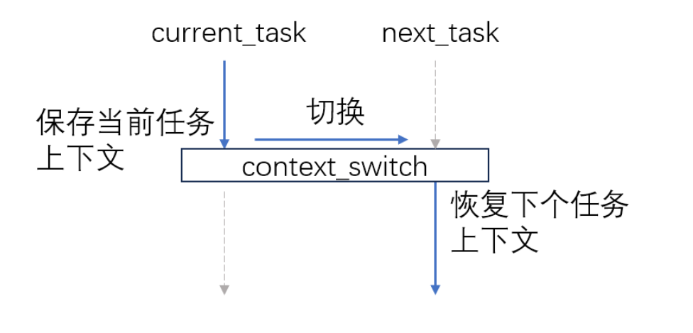 这里需要注意两个细节。第一个是寄存器集合的保存数量。在保存通用寄存器集合时,并没有保存所有的通用寄存器,其原因是根据RISC-V的函数调用约定,有一部分寄存器是由调用函数 Caller 来保存的,所以就不需要被调用函数 switch 来保存了。第二个是当前指令指针(PC)的切换。在具体切换过程中,是基于函数返回地址来进行切换的。即首先把 switch 的函数返回地址 ra (即 x1 )寄存器保存在 TaskContext 中,在此函数的倒数第二步,恢复切换后要执行线程的函数返回地址,即 ra 寄存器到 t0 寄存器,然后调用 jr t0 即完成了函数的返回。